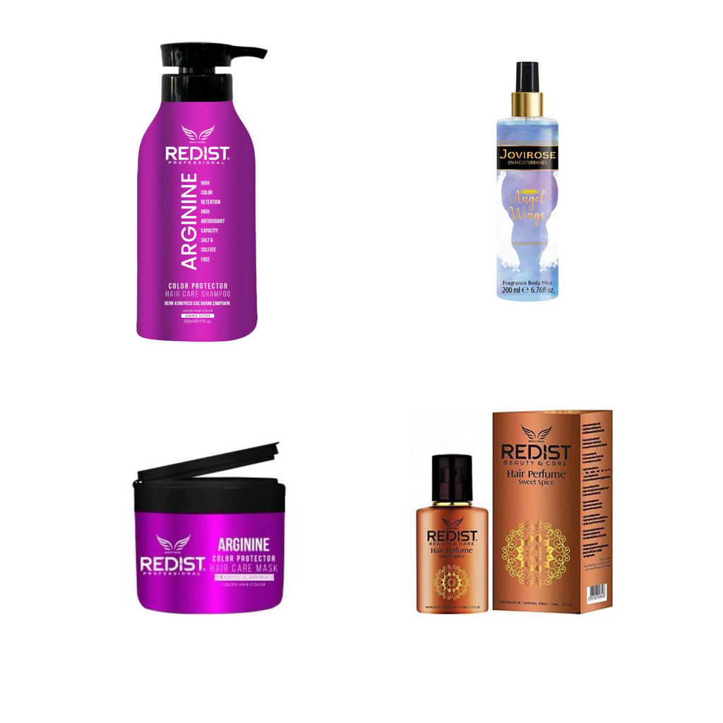Sampon cu Arginine Redist pentru protectia culorii 500 ml + Masca de par cu Arginine Redist + Parfum de par Sweet Spice Redist + Body mist Angel Wings