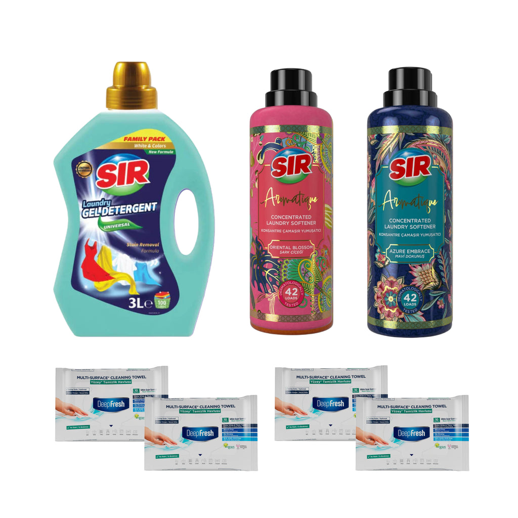 Detergent pentru haine albe și colorate Sir White & Colors 3 Litri + Balsam de rufe SIR Aromatique Concentrat 750 ml × Oriental + Azure + Şerveţele umede pentru multi suprafeţe cu bicarbonat şi oțet Deep Fresh 10 bucăți × 4 pachete