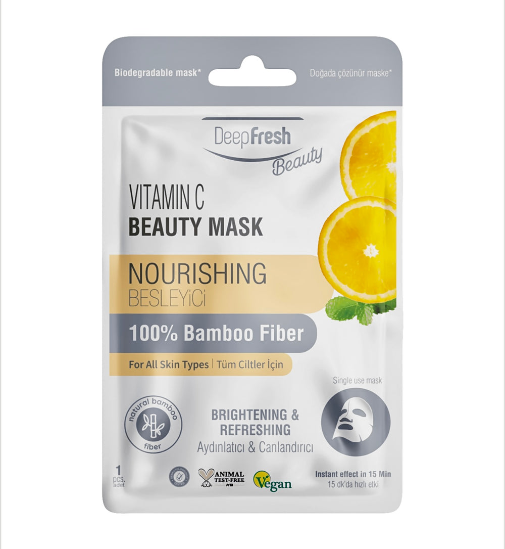● Masca servetel pentru fata hranitoare cu Vitamina C DeepFresh este din 100% fibre de bambus biodegradabile, infuzată cu ingrediente hrănitoare și revitalizante, precum și cu vitamina C antioxidantă, astfel incat oferă o îngrijire intensă și luminozitate pielii tale.